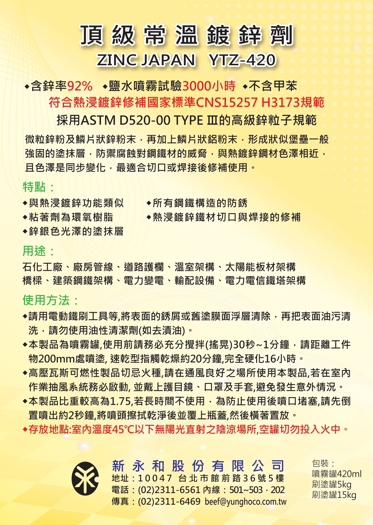 •不含甲苯,符合熱浸鍍鋅修補國家標準CNS15257 H3173規範
