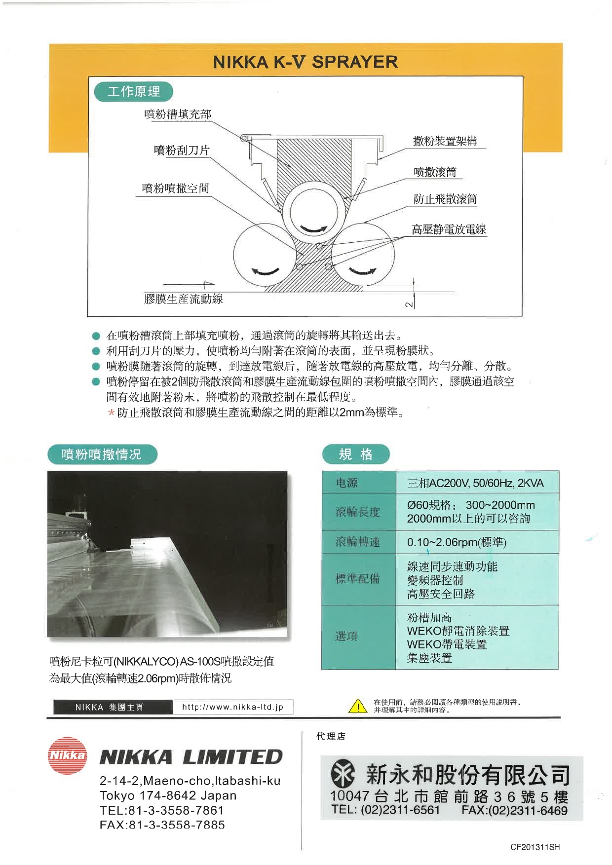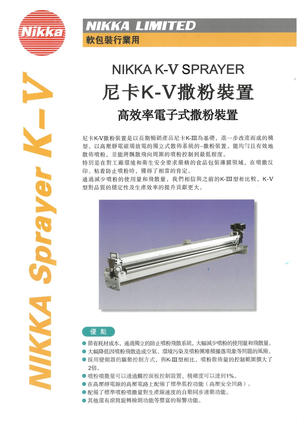 尼卡K-V撒粉装置是以長期暢銷產品尼卡K-III為基礎,進一步改進而成的機型。以高壓靜電磁場放電的獨立式散布系統的撒粉裝置,能均勻且有效地